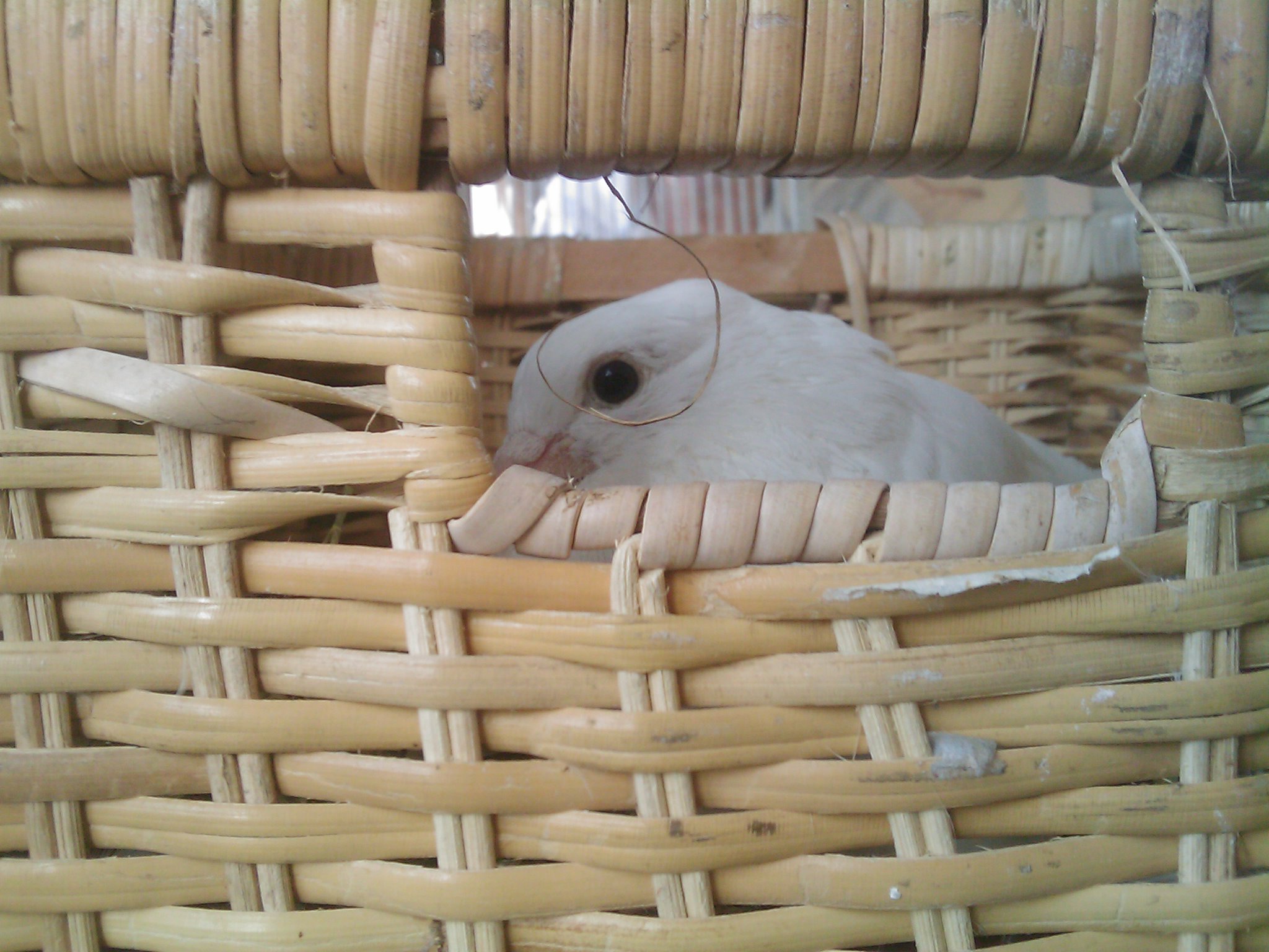 Rescued homer hen Harper making good use of the handle/window of her nest basket