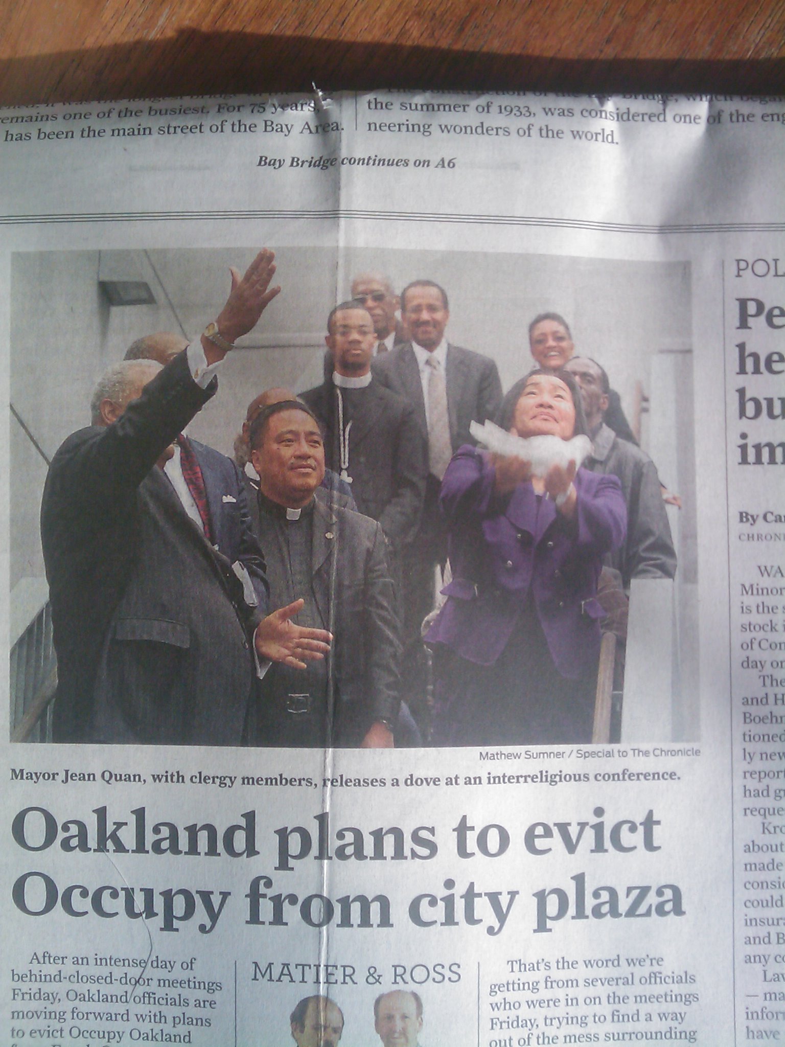 Oakland Mayor Quan released a "dove" (white pigeon) at an interreligious conference yesterday. Doubtful that it was a trained white homer, more likely a doomed baby king.