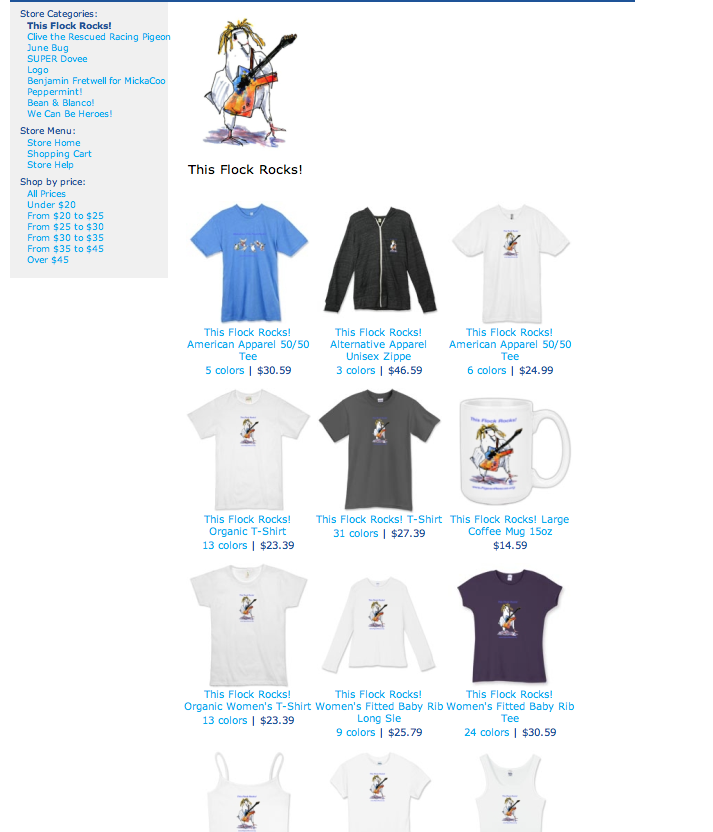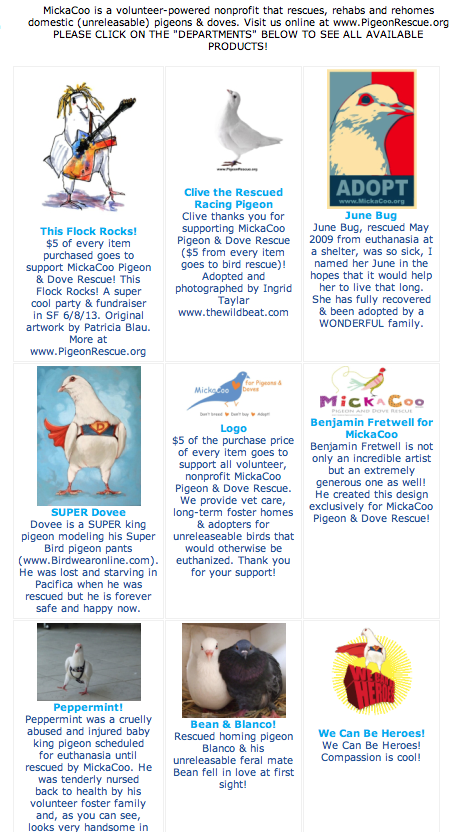 Hello! I just saved $6 off my order at http://www.printfection.com/MickaCooGear using this coupon code: MegaMeet$6 Yay!!! *(And $5 from every item supports pigeon & dove rescue!)* Check out the new designs available and use coupon code: MegaMeet$6 Support MickaCoo and look really good doing it! 8 ] Elizabeth * * *Join us on Facebook! https://www.facebook.com/MickaCooRescue* * **RSVP for This Flock Rocks! http://mickacooflockrocks.eventbrite.com/* * * *Subscribe to our newsletter http://eepurl.com/iWq1P* *MickaCoo Pigeon & Dove Rescue http://www.pigeonrescue.org/* * * *MickaCoo Video http://www.youtube.com/watch?v=QGjyooh3Yo0*