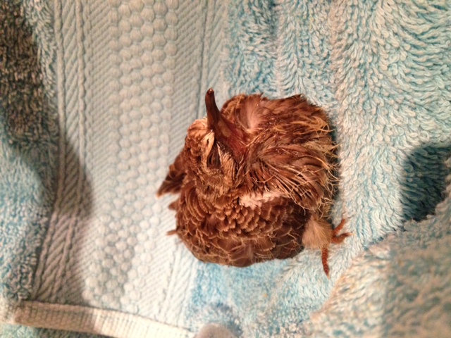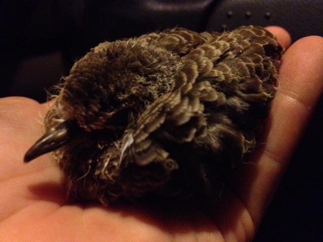 I picked her up on my way home and got some formula and pedialite into her and she's resting on heat. Very weak. I hope that I can nurse her through the night and get her to PHS tomorrow. Looks like a mourning dove nestling to me but I'm sure many on the list are more knowledgeable in the baby bird dept. Thank you to Susan for reaching out to Lila and to anyone else that may have tried to help as well. Elizabeth MickaCoo Pigeon & Dove Rescue www.RescueReport.org www.MickaCoo.org