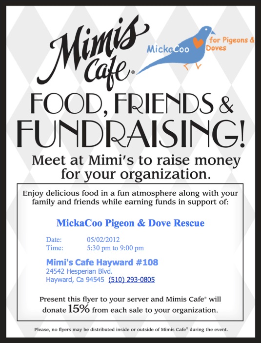 Please Join MickaCoo Tomorrow Night in Hayward for Food, Fun, Friends, Fundraising and to celebrate our beloved and amazing Louisa's birthday!!!! (She's leading this generous effort to raise funds for MickaCoo.) And, if you're not able to join us but would like to make a donation in Louisa's honor, here's the link- http://www.rescuereport.org/2009/09/donate.html LOUISA - 65 YEARS OLD?? OH MY GOODNESS -- YES!! I DON’T BELIEVE IT MYSELF - AND SINCE IT WOULD NOT BE HAPPENING WITHOUT NARCOTICS ANONYMOUS, I WOULD BE THRILLED AND GRATEFUL TO JOIN ME AND ALEX FOR A CELEBRATION MEAL, AND SMILES AND HUGS. DATE: WEDNESDAY, MAY 2 TIME: 6PM PLACE: MIMI’S CAFÉ SOUTHLAND MALL IN HAYWARD HESPERIAN BLVD, NEXT TO THE CHEVRON STATION The food is good, prices reasonable, atmosphere relaxed. And being me, of course there are birds involved here as well – Mimi’s will donate 15% of our bill to Mickacoo Bird Rescue. This will not cost us anything extra – it is a donation by Mimi’s based on our bill (see attached flier). Mickacoo does great work rescuing and rehoming the beautiful domesticated pigeons and doves (King’s, Homing, Indian Fantails, ring neck doves) who get dumped at shelters. THEY MAKE GREAT PETS! These birds are domesticated and will die on the street, and shelters used to just euthanize them until Mickacoo stepped in to help. I would really love to have you come and celebrate with me and Alex - hope to see you there! Hope to see you there! Elizabeth *MickaCoo Pigeon & Dove Rescue * * * *Subscribe to our newsletter. http://eepurl.com/iWq1P* * * *Please help us help birds in need. Make a donation to MickaCoo today.http://www.globalgiving.org/projects/mickacoo-pigeon-and-dove-rescue * * * *Join us on Facebook! https://www.facebook.com/MickaCooRescue* Until they all have homes, don't buy, don't breed- adopt. www.RescueReport.org www.MickaCoo.org http://www.youtube.com/watch?v=QGjyooh3Yo0