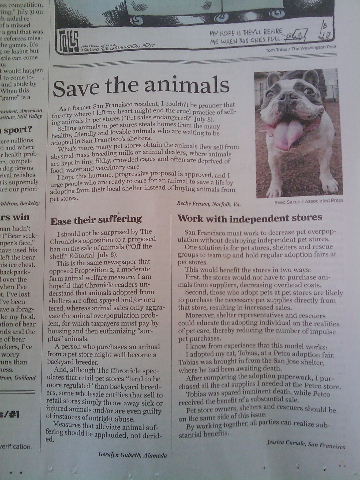http://www.sfgate.com/columns/letterstoeditor/archive/ -- Elizabeth Until they all have homes, don't buy, don't breed- adopt. www.RescueReport.org http://www.rescuereport.org/ www.MickaCoo.org http://www.mickacoo.org/ http://www.youtube.com/watch?v=QGjyooh3Yo0