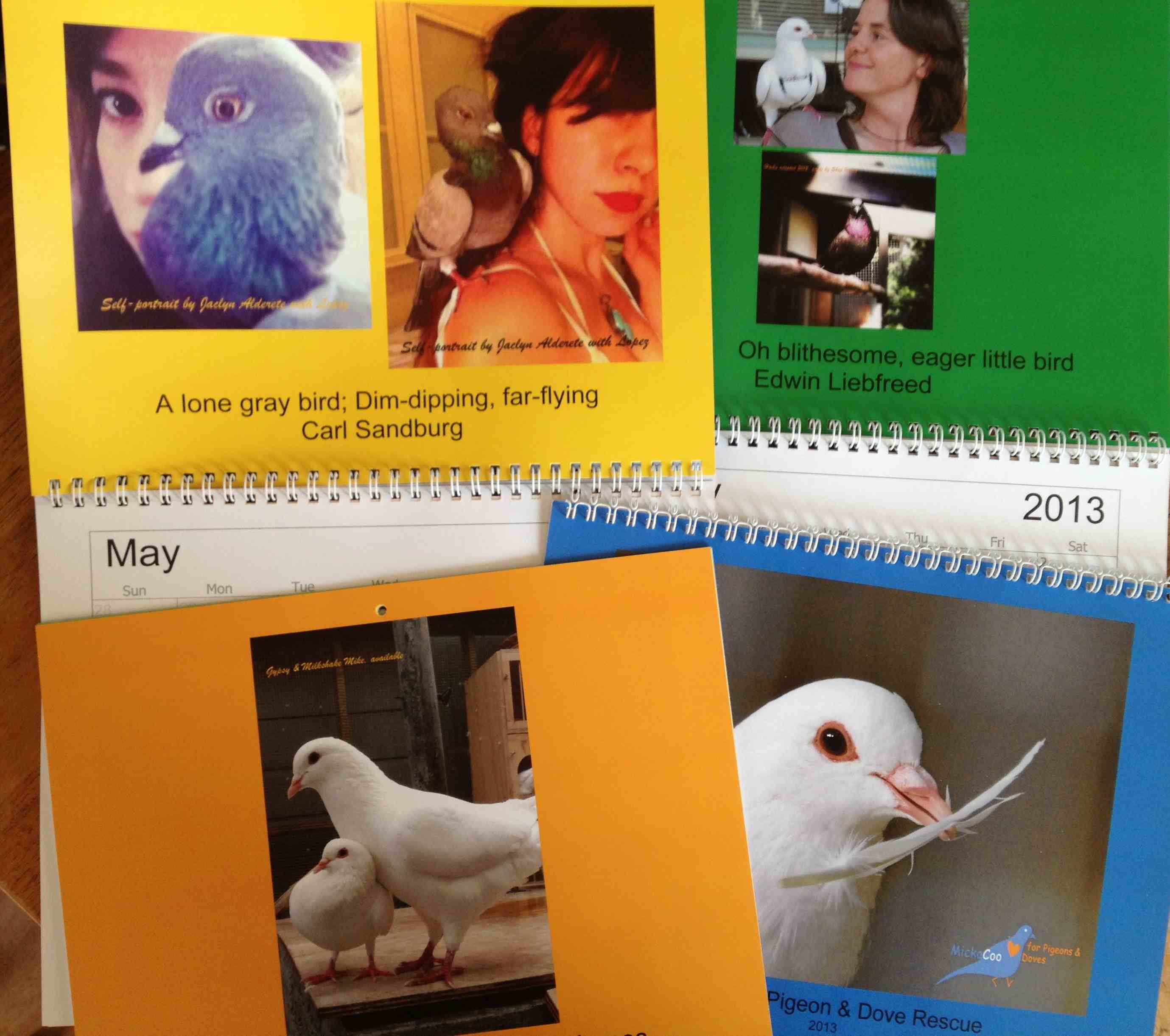 Hello! We have just a couple more 2013 MickaCoo Calendars left! You'll get a whole year of MickaCoo charm for just $23 (includes shipping) and your purchase supports your favorite pigeon & dove rescue. 8 ] If you'd like one, please let me know ASAP and I'll give you the details. *** Also- while I'm in your Inbox, please consider donating (and promoting the donation of) unwanted household, clothing, electronics, etc. in MickaCoo Pigeon & Dove Rescue's name to Community Thrift in SF. We will get a much needed portion of the proceeds. Here's a link with details - http://www.communitythriftsf.org/donate/ Thank you! Elizabeth *MickaCoo Pigeon & Dove Rescue http://www.PigeonRescue.org* * * *Donate to support MickaCoo Pigeon & Dove Rescuehttp://www.rescuereport.org/2009/09/donate.html * * * *Join us on Facebook! https://www.facebook.com/MickaCooRescue* *Subscribe to our newsletter http://eepurl.com/iWq1P* Until they all have homes, don't buy, don't breed- adopt. www.PigeonRescue.org www.RescueReport.org http://www.youtube.com/watch?v=QGjyooh3Yo0
