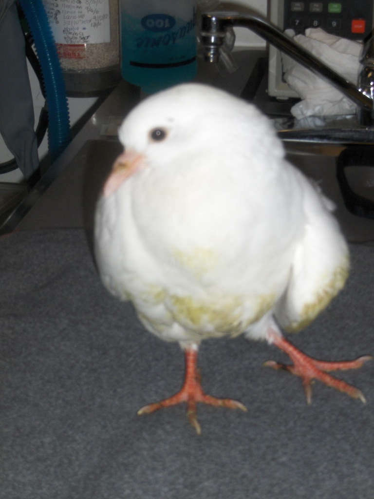 Hello- A week ago, the Montclair Vet Hospital (in Oakland) was kind enough to take in and stabilize a stray baby king pigeon in pretty pitiful condition. It has paratyphoid (salmonella) which creates swollen, painful joints (thus the splayed stance) and requires a 30 day course of Baytril to cure as well as some Meloxicam along the way for pain relief. This little one is now ready for an indoor foster home. Baby king pigeons are extremely easy (and dear) to care for. This one, which I've named Montclair, needs a dog-crate or similar-sized cage, access to a heating pad and the view out a window if at all possible, daily maid and room service and twice a day meds. Should be quarantined and given some TLC. Montclair will be able to move into a foster aviary with about 3-4 weeks. Please reply to AdoptKings@gmail.com if you can help this baby bird. Thank you! e -- Elizabeth *PLEASE vote for Mickaboo & 'Coo Bird Rescues today **& every day* *this month to help us win a MUCH needed $50K grant! * **www.refresheverything.c om/mickaboobirdrescue Until they all have homes, don't buy, don't breed- adopt. www.RescueReport.org www.MickaCoo.org http://www.youtube.com/watch?v=QGjyooh3Yo0