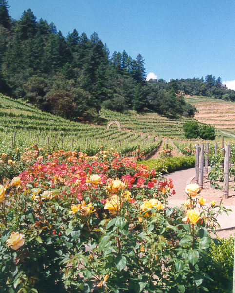 foreground, an aviary in the middle ground and winery stuff (vineyards,