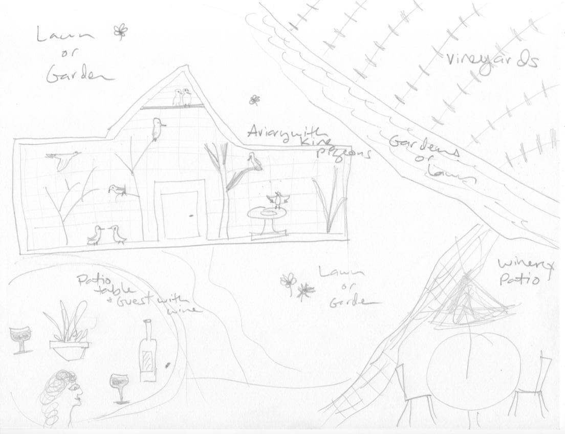 I am so committed to this effort that I have attached my own (pitiful!) drawing in order to inspire an artist out there... all I need is a sketch (or photo-shopped image) that shows a winery patio with a guest in the foreground, an aviary in the middle ground and winery stuff (vineyards, etc.) in the background.