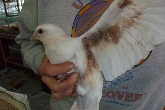 Hello- MickaCoo was recently contacted by San Jose Animal Control Services to rescue a seriously injured (hawk struck) homing pigeon that would otherwise be euthanized. Tina K was kind enough to rush out on a rainy night to pick her up from the shelter and then rush her 20 miles in the other direction to Dr. Sanders' where she required surgery to debried and close her wound. This incredibly lucky-to-be-alive bird, named Raspberry, was then taken home for foster care by Louisa J and is healing very well thanks to all the quick care and ongoing TLC. If you can, please consider donating towards her $510 (and still climbing) vet bill. This link will take you to a page that describes how to donate to MickaCoo (via Mickaboo's PayPal or by check). If you do donate towards Raspberry's care, please include a note that says "for pigeon Raspberry" or email me so that it is routed to MickaCoo. Thank you for considering, e Elizabeth Young adoptkings@gmail.com