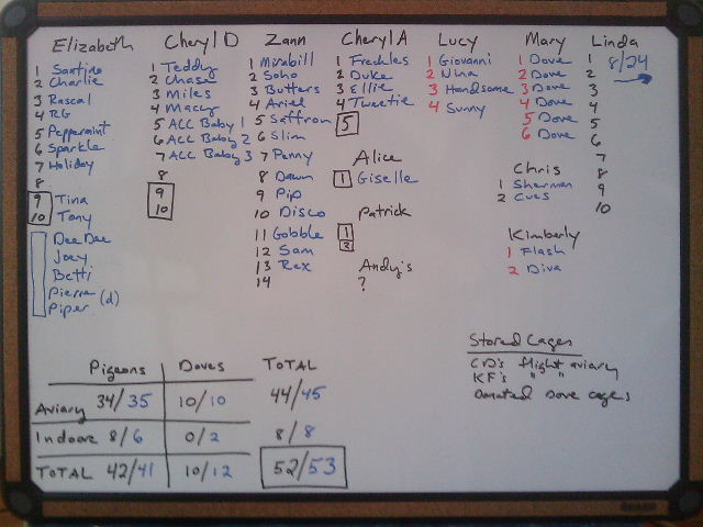 Just FYI, here's a snapshot of MickaCoo's "foster roster" as of 8/20. Black numbers represent available slots (which aren't really available because we don't have birds that currently fit those slots and we're over our capacity overall). Red numbers represent temporary slots with birds that need to be relocated. Black numbers in boxes mean indoor/supportive care slots. Linda (the right-most column) has an aviary that will be able to take 10 doves probably starting 9/1. We've got 52 slots and 53 birds. Adoptions have been almost non-existent since June and, until some birds are adopted, I don't feel comfortable having MickaCoo take on any more fosters. Personally, I'm overfull and need to significantly cut back both my number of foster birds and the hours I volunteer. I've attached the adoption flyer and the fundraiser "save the date". Please share them far and wide! [image: 20100820_Foster_Roster.jpg] Thanks! e -- Elizabeth Until they all have homes, don't buy, don't breed- adopt. www.RescueReport.org http://www.rescuereport.org/ www.MickaCoo.org http://www.mickacoo.org/ http://www.youtube.com/watch?v=QGjyooh3Yo0