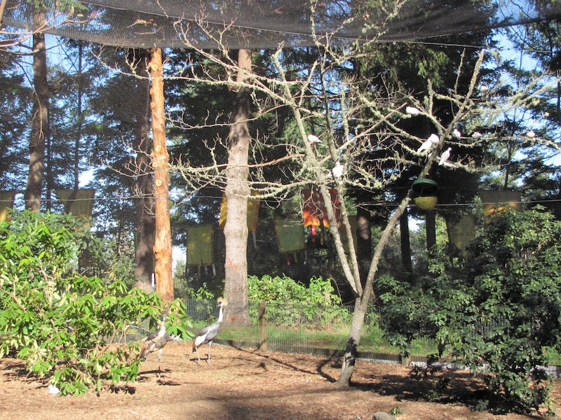 Here's some info about their aviary and pix attached- *the size of our current aviary is 60 ft. x 80 ft. x 30 ft. high. it is in the forest next to our retreat center. There are about a dozen peacocks, a dozen golden pheasants and ~25 white ringneck doves. they have a lot of room to move and perch on trees.*