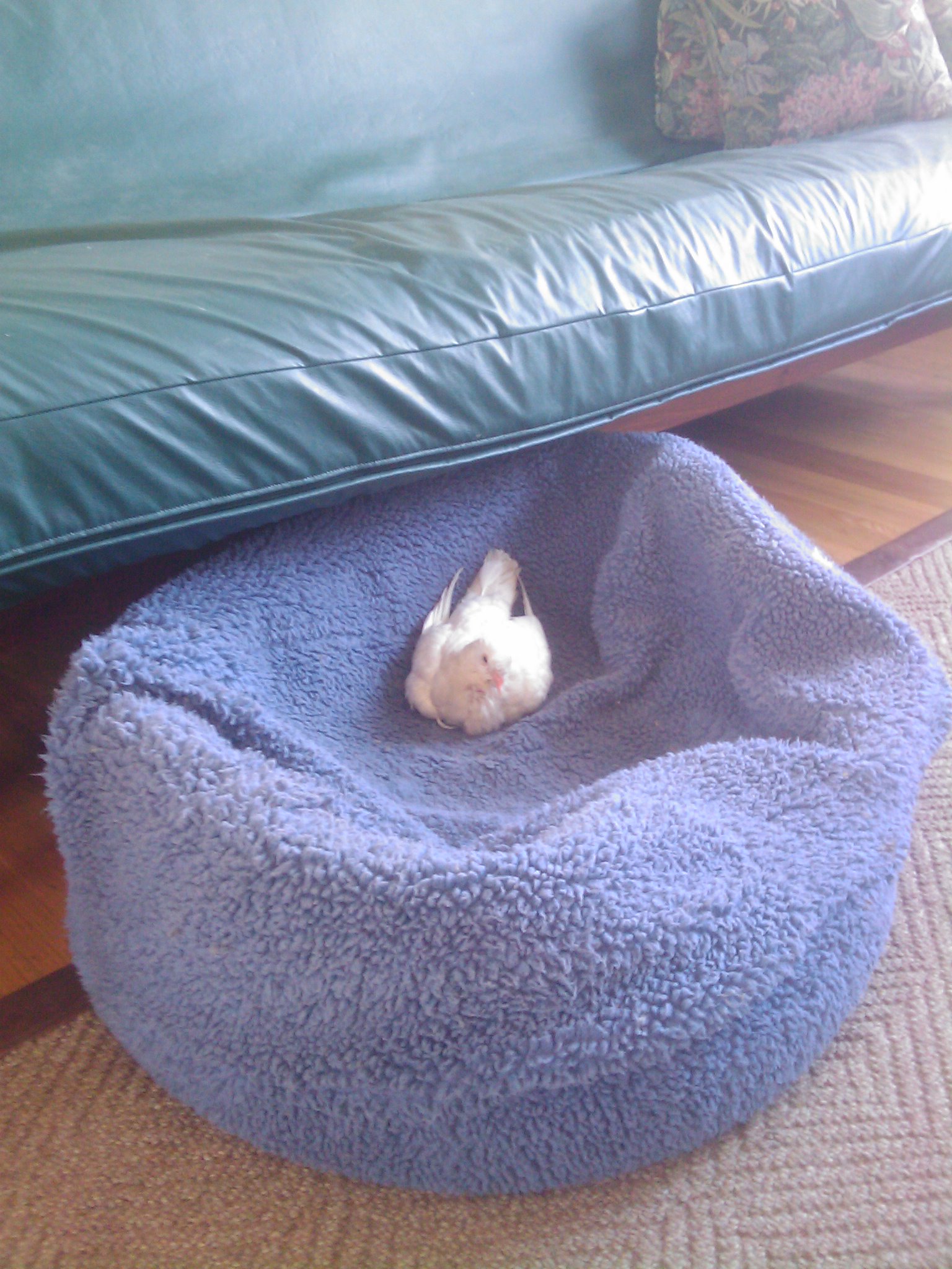 Resued baby homer Gypsy plays Goldilocks in one of the (long -suffering) dog's beds