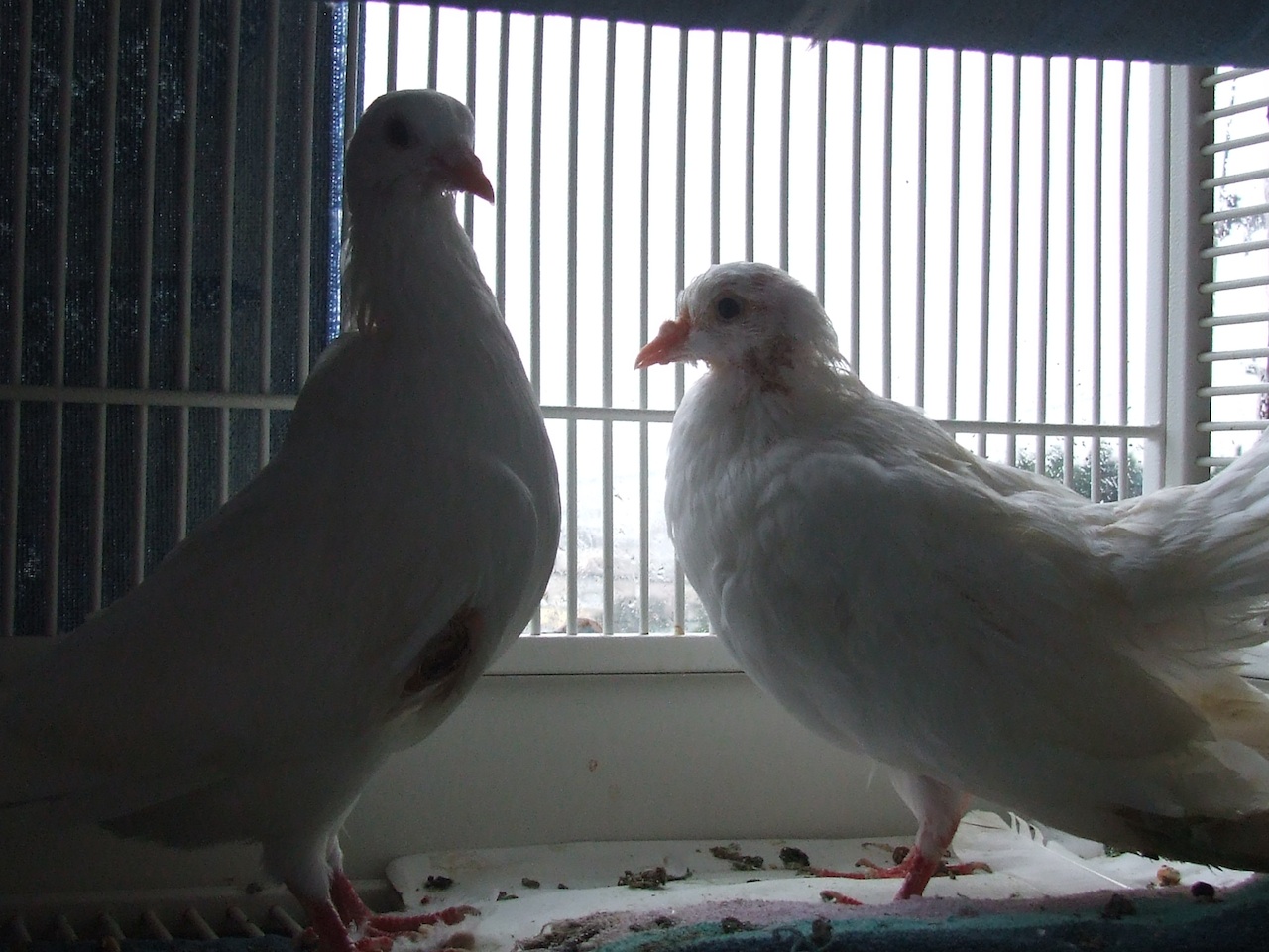 These two birds are not yet named (suggestions are welcome). The homer on the left has a granuloma and the fantail on the right will need some rehab to get healthy and strong. Genders are unknown and they are more roommates than married. Twelve pigeons were surrendered to Marin Humane Society and, with the help of MickaCoo volunteer Shae and transport assistance from WildCare staffer Kelle, MickaCoo took four frail ones into foster care. Elizabeth & MickaCoo Pigeon & Dove Rescue * * *We did it! Thank you!* Until they all have homes, don't buy, don't breed- adopt. www.RescueReport.org www.MickaCoo.org http://www.youtube.com/watch?v=QGjyooh3Yo0