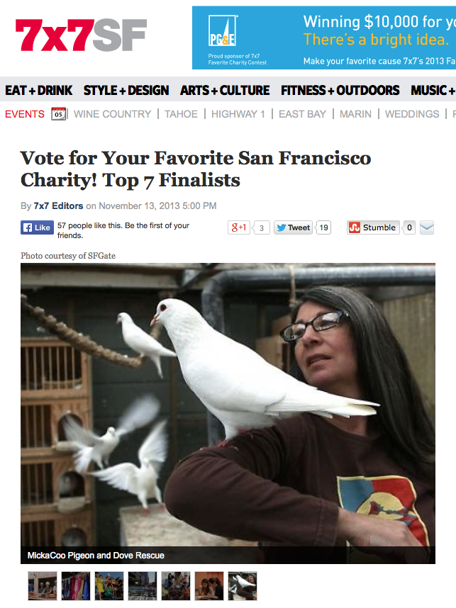 Hello Fellow Bird Lovers, We would LOVE to have your support in our "underbird" bid to win $10K as SF's Top Charity 2013! (We're competing with the SF Food Bank, Habitat for Humanity and other amazing charities!) We were able to beat the odds and were voted a *Top 7 SF Charity for 2013 and now there 4 more days to vote vote vote for us to win $10K! * *There are no limits on the number of times that you can vote- all with the same email address! Some of our supporters are entering 100 votes every day.* MickaCoo Pigeon & Dove Rescue works hard to save the lives of domestic, unreleasable birds that would otherwise be killed in shelters for lack of adopters and it takes a lot of "palomacy" (pigeon & dove diplomacy) to bring the plight and potential of these gentle birds into the public's awareness. So, imagine how excited and proud we are to be included in 7x7's Top 7 (!!) San Francisco Charities for 2013! And, with your votes, we aim to win a much needed $10K as the #1! Many of you are already voting for us every day- thank you! To vote, click herehttp://www.7x7.com/arts-culture/vote-your-favorite-san-francisco-charity-top..., scroll down (we're the last listed) and select MickaCoo Pigeon & Dove Rescue. There's no limit on the number of times that you can vote everyday until 11/29. We only wish the pigeons and doves could vote! *To help us, click this link, scroll to the bottom, select MickaCoo Pigeon & Dove Rescue, submit and repeat! * *http://www.7x7.com/arts-culture/vote-your-favorite-san-francisco-charity-top... http://www.7x7.com/arts-culture/vote-your-favorite-san-francisco-charity-top...* Please share on Facebook and with your friends and family! *Thank you!!!* Elizabeth *We did it! We Are a Top 7 SF Charity for 2013! THANK YOU! * *Now we're going for #1 and a $10K prize!* *Please vote for MickaCoo as #1 SF Charity 2013! http://www.7x7.com/arts-culture/vote-your-favorite-san-francisco-charity-top...* *Vote for us a lot!!! Every day until 11/29! We're the last one in the list- scroll to the bottom & select MickaCoo as your choice! Thank You!* *MickaCoo Video http://www.youtube.com/watch?v=QGjyooh3Yo0* *Join us on Facebook! https://www.facebook.com/MickaCooRescue * *www.PigeonRescue.org http://www.PigeonRescue.org* *Subscribe to our newsletter http://eepurl.com/iWq1P * *Please sign & share our Pledge to Say No to Squab! http://www.thepetitionsite.com/908/812/754/pledge-to-stop-eating-baby-pigeon...*