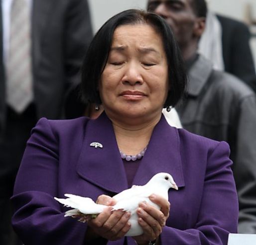I'm very happy to say, based on this picture, that Mayor Quan released banded homing pigeons (rather than doves or baby king pigeons) which means this was professionally done and that the trained white homers most likely made it home safely (though we do rescue a fair amount of homers too). Yay! -- Elizabeth *MickaCoo Pigeon & Dove Rescue - Join us at https://www.facebook.com/MickaCooRescue* Until they all have homes, don't buy, don't breed- adopt. www.RescueReport.org www.MickaCoo.org http://www.youtube.com/watch?v=QGjyooh3Yo0
