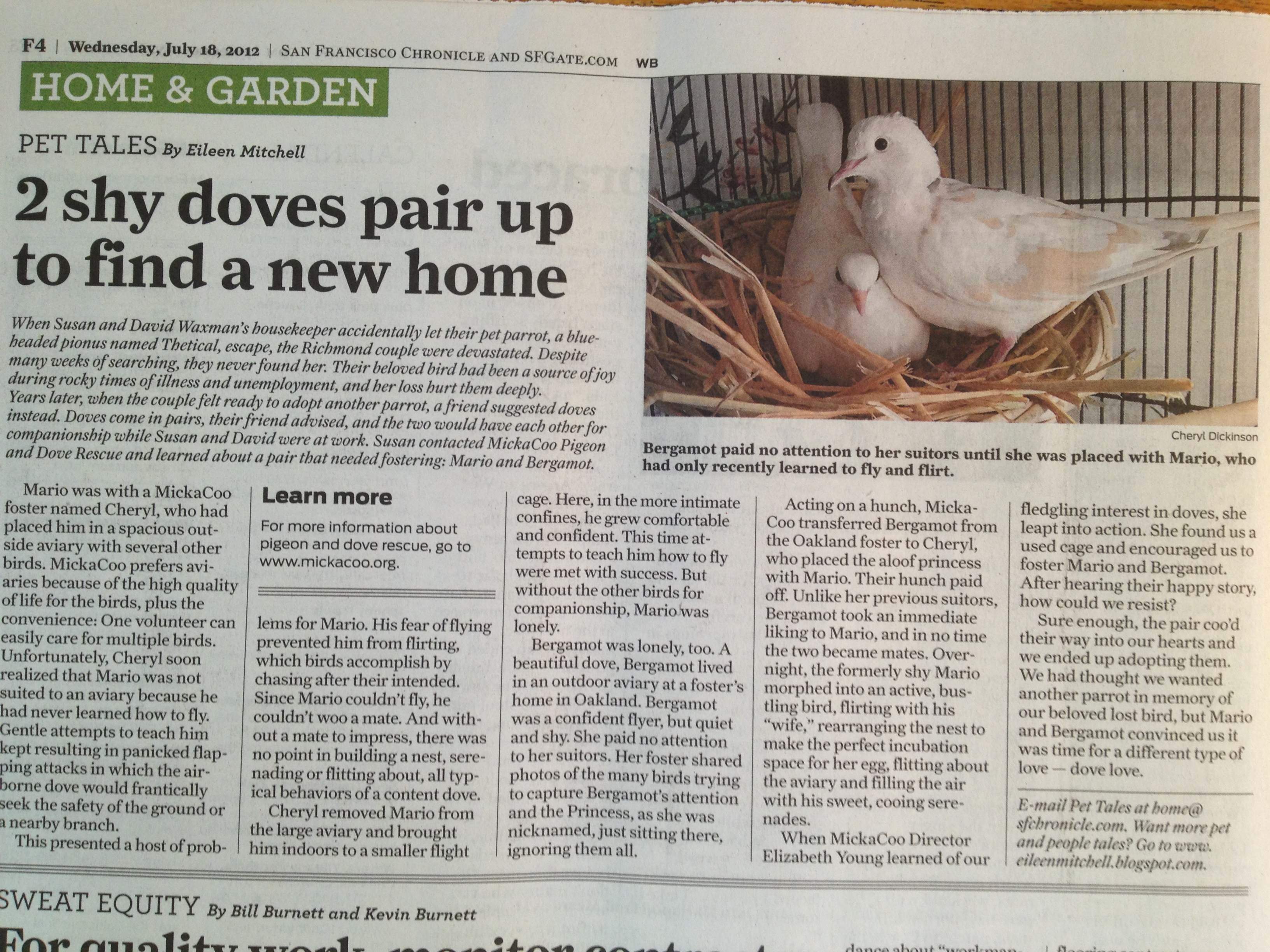 Big thanks to Cheryl & Janelle & JJ for fostering these sweet birds and super big thanks to Susie & David for adopting them and making them famous!!! http://www.sfgate.com/default/article/2-shy-doves-pair-up-to-find-a-new-home... P.S. Columnist Eileen Mitchell loves getting bird stories (she never has enough) and is lovely to work with. If you have a story about a pet bird that you'd like to share, please write her at "Eileen Mitchell" < mitchei@msn.com>, Elizabeth *MickaCoo Pigeon & Dove Rescue * * * *MickaCoo Presents We Can Be Heroes! 8/26 in Tiburonhttp://mickacoo.eventbrite.com/ * * * *Join us on Facebook! https://www.facebook.com/MickaCooRescue* *Subscribe to our newsletter http://eepurl.com/iWq1P* Until they all have homes, don't buy, don't breed- adopt. www.RescueReport.org www.MickaCoo.org http://www.youtube.com/watch?v=QGjyooh3Yo0