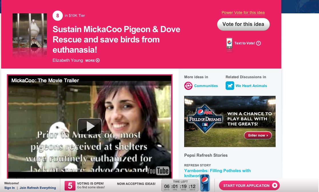 Yay!!!! MickaCoo's Pepsi rank has climbed to #8 thanks to a WHOLE LOT of votes and support from a whole lot of people but we've got another 25.5 hours to go and it will get tougher rather than easier! THANK YOU for all your help so far and for your continued support through till 9 pm tomorrow. We need every bit of it! Elizabeth & MIckaCoo * * *Please help MickaCoo win a much-needed Pepsi grant- vote everyday at http://www.refresheverything.com/mickacoo* Until they all have homes, don't buy, don't breed- adopt. www.RescueReport.org www.MickaCoo.org http://www.youtube.com/watch?v=QGjyooh3Yo0